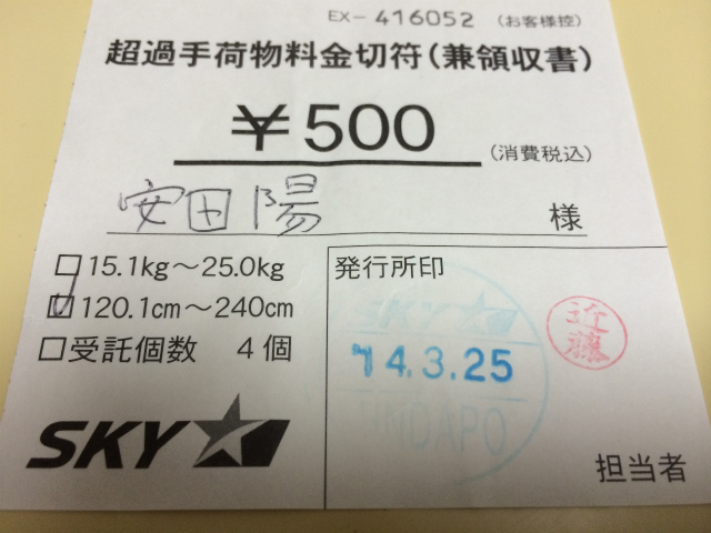 【上の写真】 ベースのケースがほんの2〜3センチオーバーしただけで きっちり超過料金とられました。 しかし、近藤さんにはもうちょっときれいな字を書いてほしかったですね。