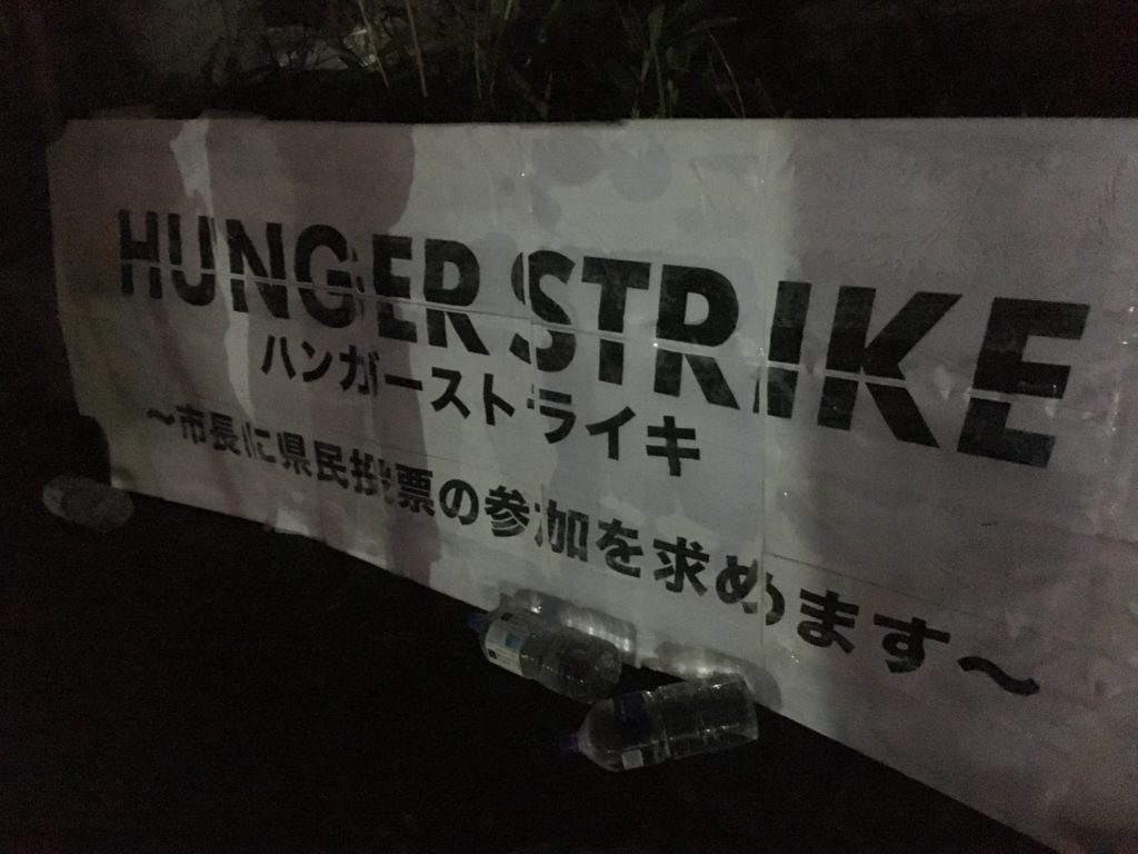 「辺野古」県民投票の会の元山さんが宜野湾市役所前でハンガーストライキ中。