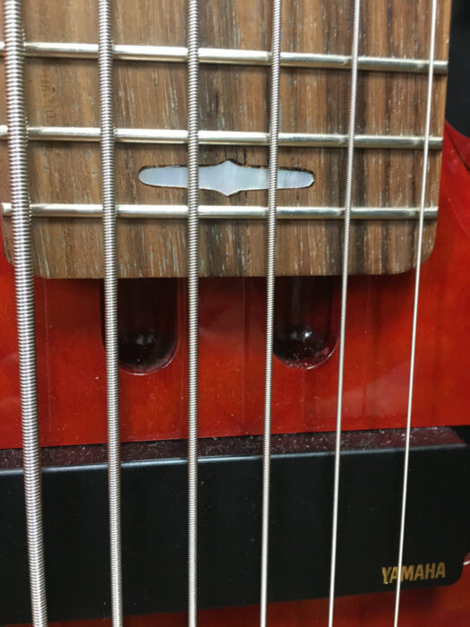 指板はローズ。目は粗い。ふだんはエボニーやメイプル指板のベースばかり使っているのでよくわからないのだが、ローズはこのくらいの目の粗さがわりとフツーなのかもしれない。