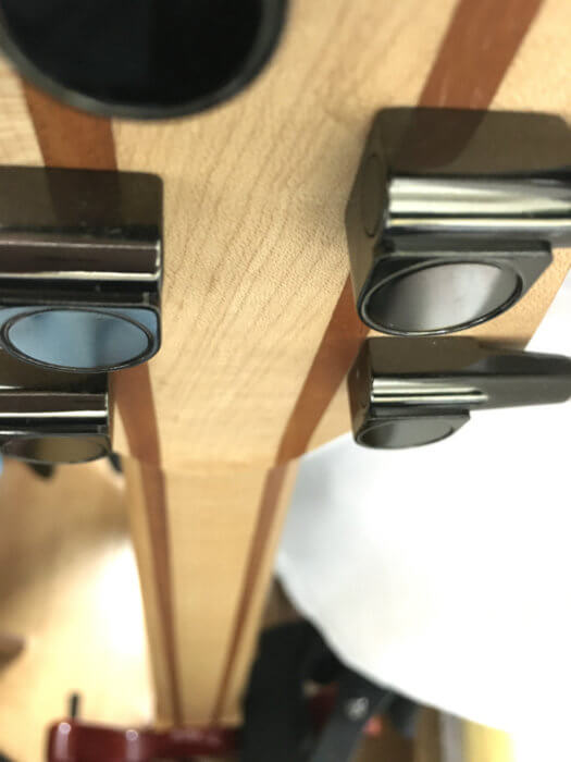 非常にコンパクトにまとめられたヘッド。オモテにはメイプルの化粧板?が薄く貼られており、見た目Good。重量バランス的にもヘッドは小さい方が良い。よくこの小さなヘッドにペグ6つ付けられたなぁと。
