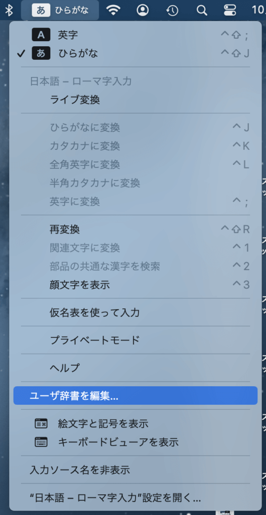 1)日本語入力プログラムの「ユーザ辞書を編集…」をクリック