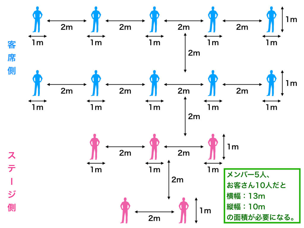 メンバー間、お客さん間それぞれ2mずつあけることを想定して計算してみた。それが以下の図。